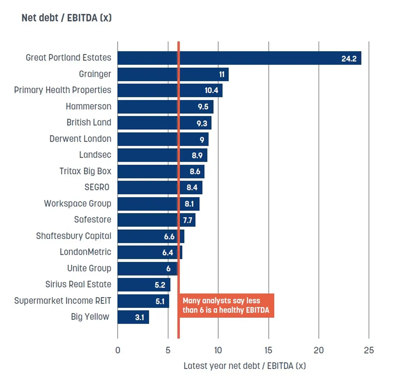 At the other end of the spectrum are income-focused businesses such as Big Yellow (3.1x), Supermarket Income REIT (5.1x) and Unite (6x), where stable, high-yielding portfolios support lower-leverage multiples.