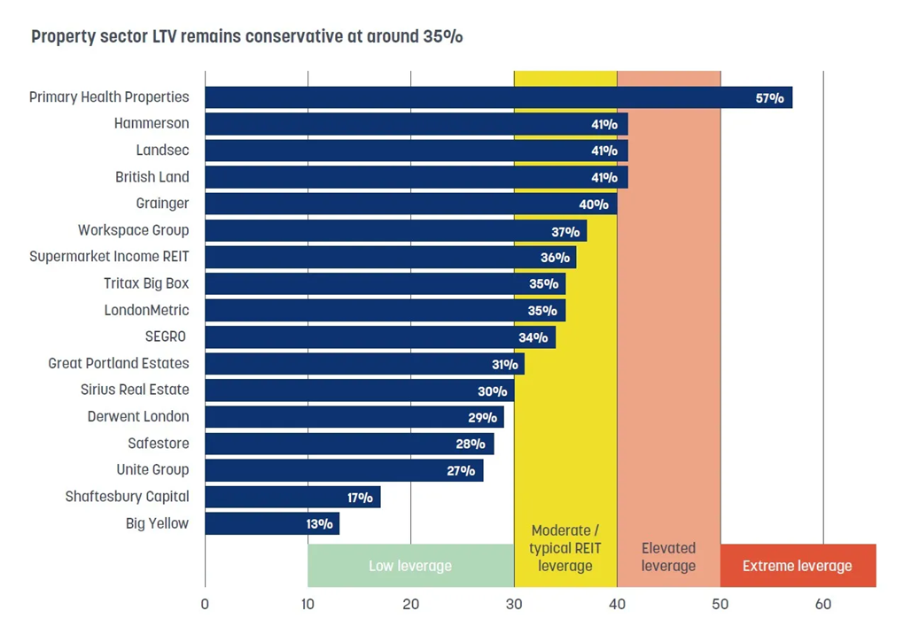 The companies with the lowest LTV include Big Yellow (13%), Shaftesbury Capital (16.8%), Unite (27%), Safestore (28.1%), Derwent London (29.4%) and Sirius (30.4%).