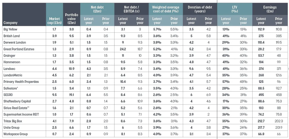 All reporting periods relate to FY2025. To enhance comparability, EPRA metrics were used where available, alongside proportionally consolidated figures to capture each company’s share of joint venture (JV) exposure. EPRA metrics include net debt, earnings and loan-to-value (LTV). In cases where EPRA LTV is not applicable due to valuation methodology, such as Big Yellow, which values assets on an operational rather than investment property basis, alternative ratios (such as net debt to gross property assets) have been used instead.